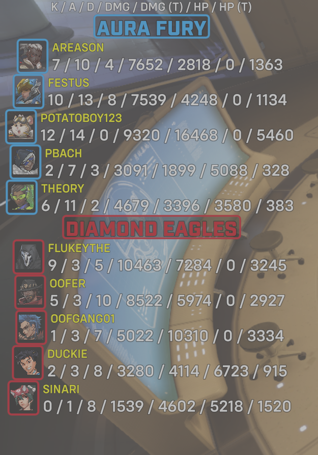10 entries| Team | Player | Kills | Assists | Deaths | Damage | Damage (Taken) | Healing | Healing (Taken) |
