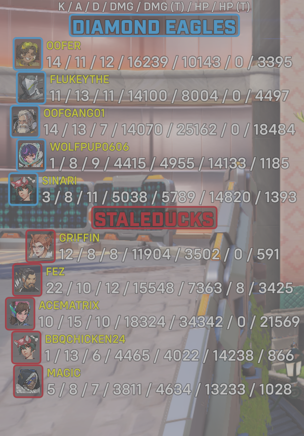 10 entries| Team | Player | Kills | Assists | Deaths | Damage | Damage (Taken) | Healing | Healing (Taken) |