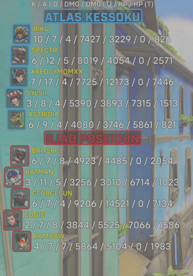 10 entries| Team | Player | Kills | Assists | Deaths | Damage | Damage (Taken) | Healing | Healing (Taken) |