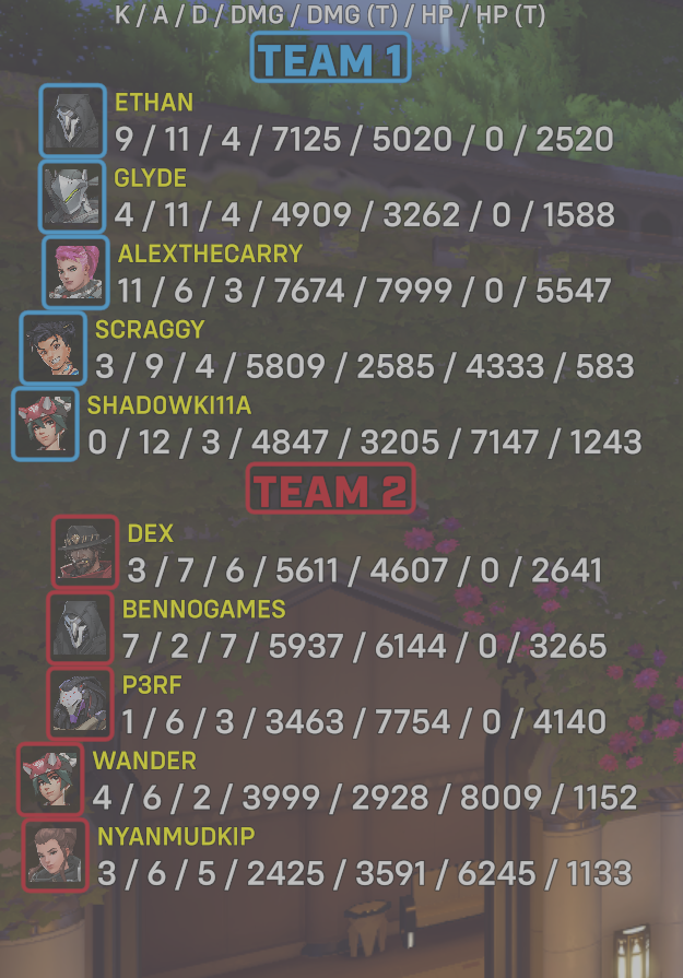 10 entries| Team | Player | Kills | Assists | Deaths | Damage | Damage (Taken) | Healing | Healing (Taken) |