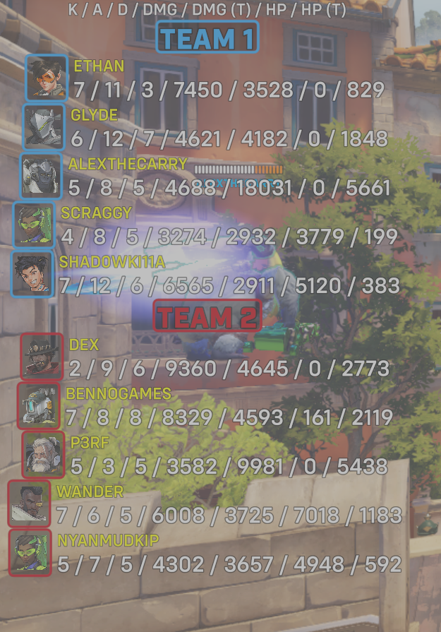 10 entries| Team | Player | Kills | Assists | Deaths | Damage | Damage (Taken) | Healing | Healing (Taken) |