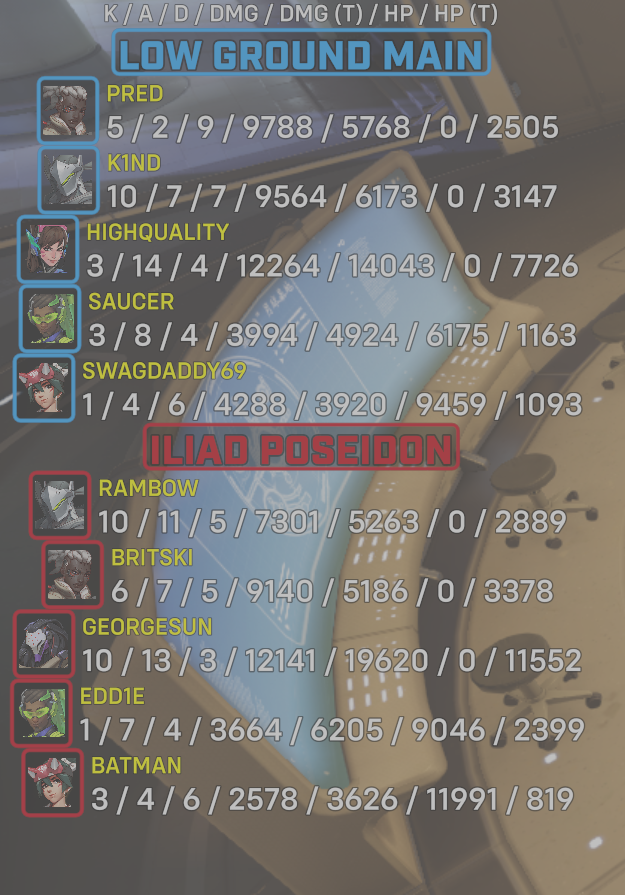 10 entries| Team | Player | Kills | Assists | Deaths | Damage | Damage (Taken) | Healing | Healing (Taken) |