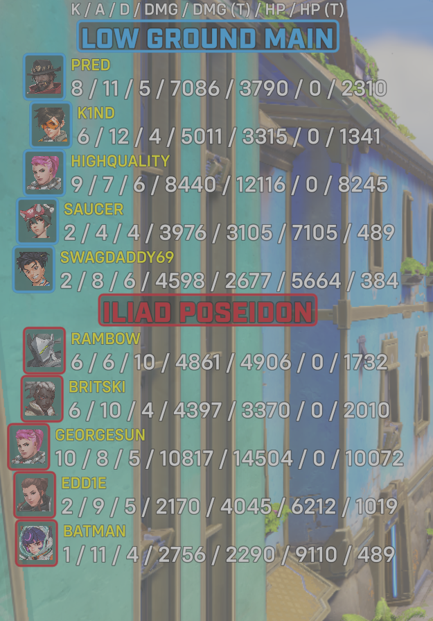 10 entries| Team | Player | Kills | Assists | Deaths | Damage | Damage (Taken) | Healing | Healing (Taken) |