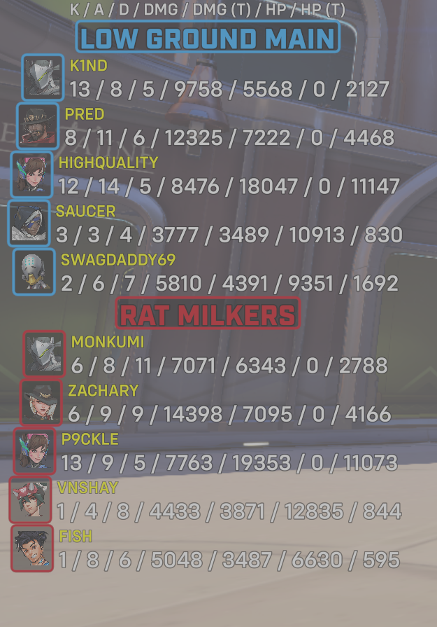 10 entries| Team | Player | Kills | Assists | Deaths | Damage | Damage (Taken) | Healing | Healing (Taken) |