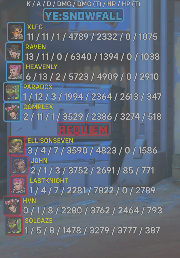 10 entries| Team | Player | Kills | Assists | Deaths | Damage | Damage (Taken) | Healing | Healing (Taken) |