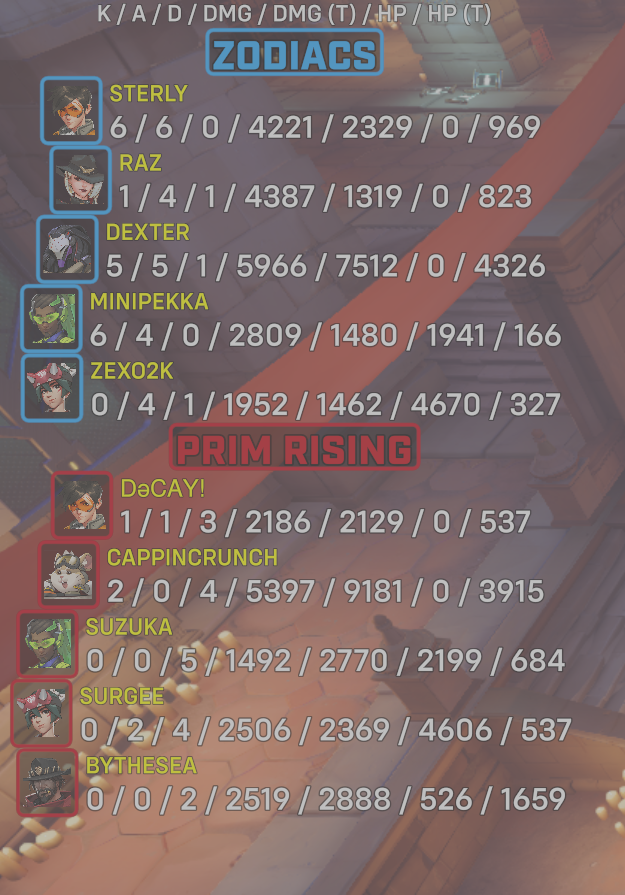 10 entries| Team | Player | Kills | Assists | Deaths | Damage | Damage (Taken) | Healing | Healing (Taken) |
