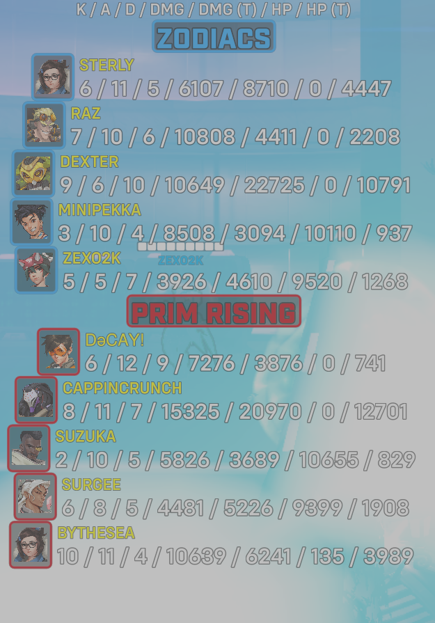 10 entries| Team | Player | Kills | Assists | Deaths | Damage | Damage (Taken) | Healing | Healing (Taken) |