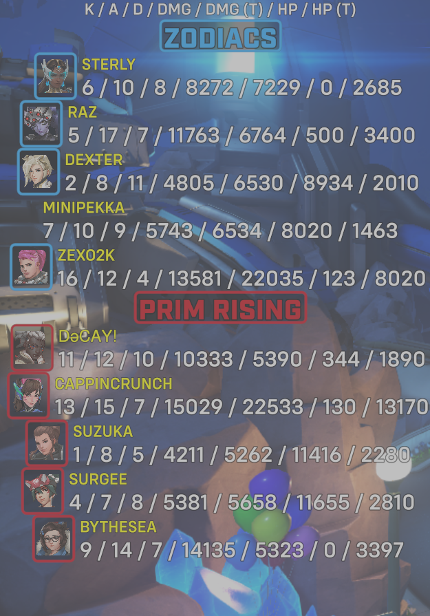 10 entries| Team | Player | Kills | Assists | Deaths | Damage | Damage (Taken) | Healing | Healing (Taken) |
