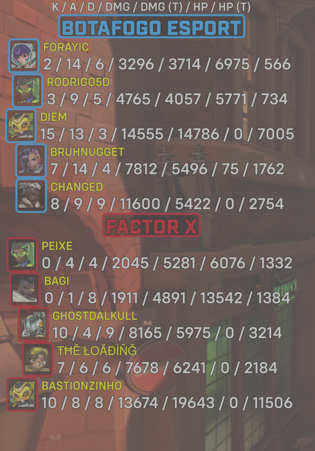 | Botafogo E-sport | GhostDalkull#2356 | 10 | 4 | 9 | 8165 | 5975 | 0 | 3214 |