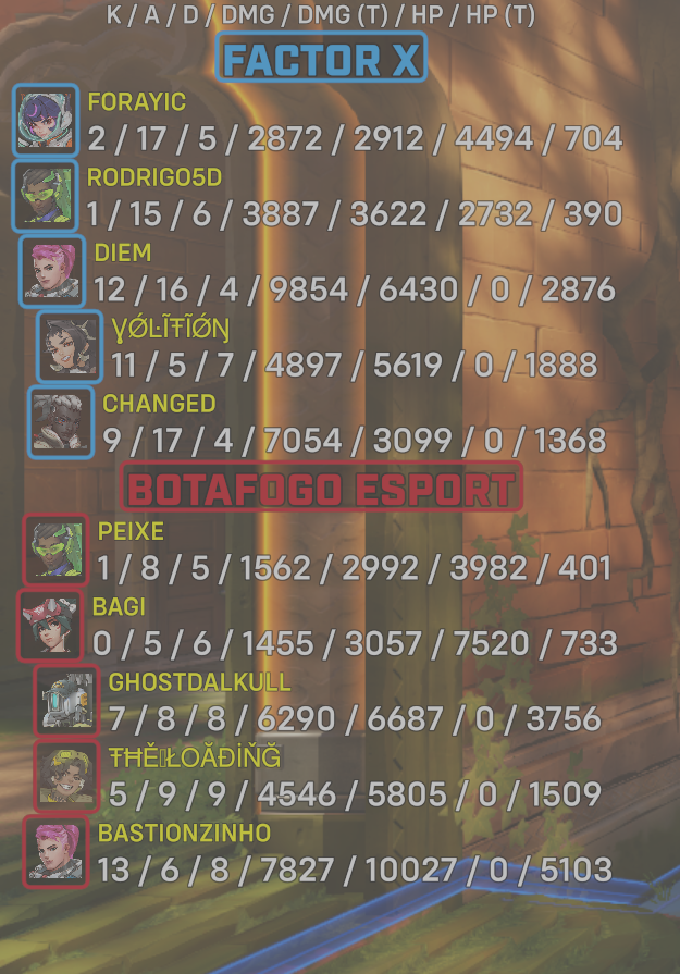| Team | Player | Kills | Assists | Deaths | Damage | Damage (Taken) | Healing | Healing (Taken) |