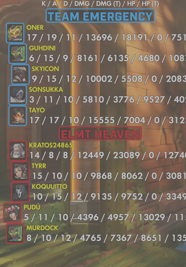 | Team Emergency OW | koquuitto#1822 | 10 | 15 | 12 | 9135 | 9752 | 0 | 3349 |