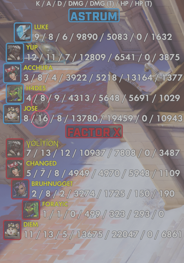 | Team | Player | Kills | Assists | Deaths | Damage | Damage (Taken) | Healing | Healing (Taken) |