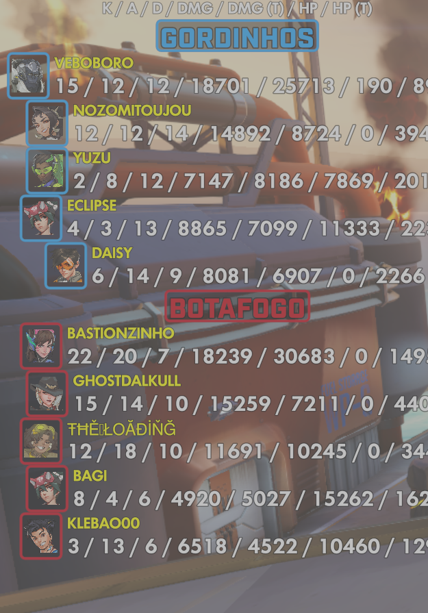 | Team | Player | Kills | Assists | Deaths | Damage | Damage (Taken) | Healing | Healing (Taken) |