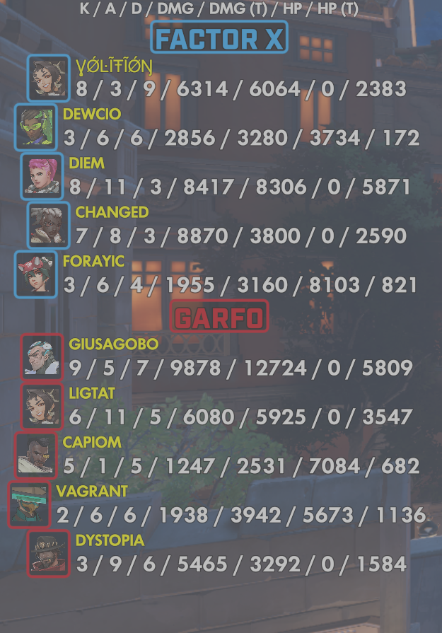 | Team | Player | Kills | Assists | Deaths | Damage | Damage (Taken) | Healing | Healing (Taken) |