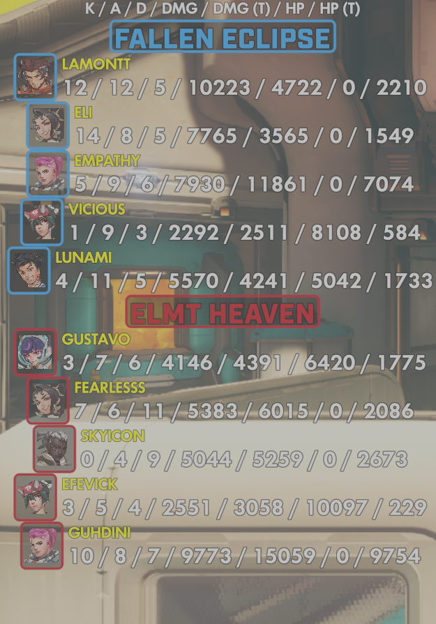 10 entries| Team | Player | Kills | Assists | Deaths | Damage | Damage (Taken) | Healing | Healing (Taken) |