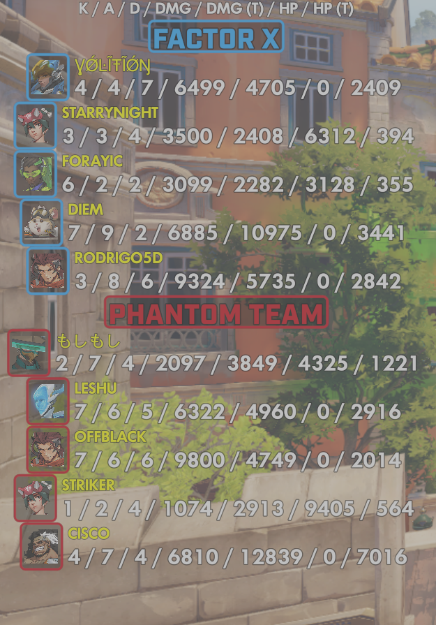 10 entries| Team | Player | Kills | Assists | Deaths | Damage | Damage (Taken) | Healing | Healing (Taken) |