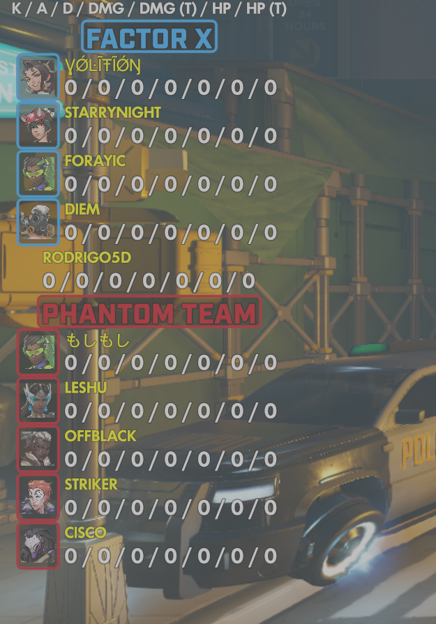 9 entries| Team | Player | Kills | Assists | Deaths | Damage | Damage (Taken) | Healing | Healing (Taken) |