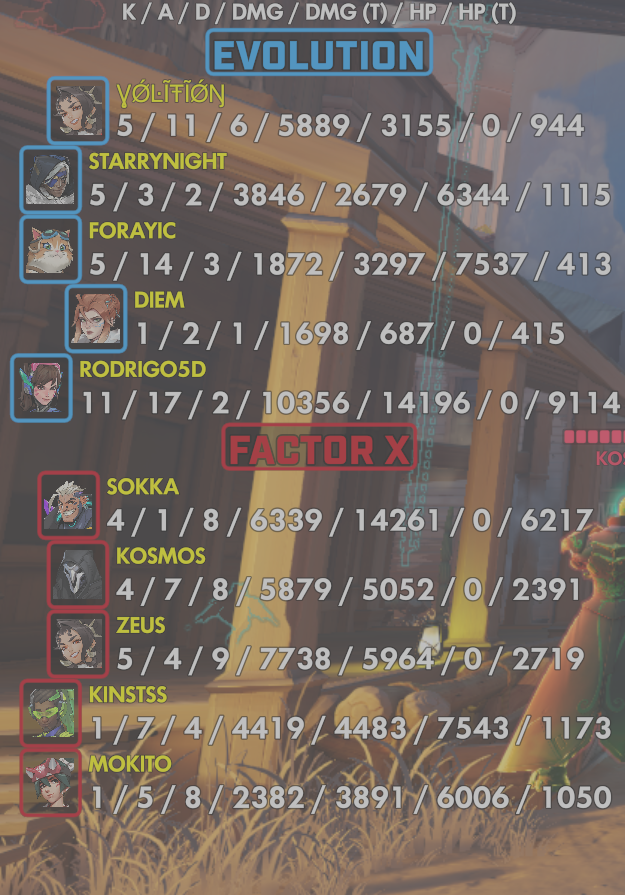 5 entries| Team | Player | Kills | Assists | Deaths | Damage | Damage (Taken) | Healing | Healing (Taken) |