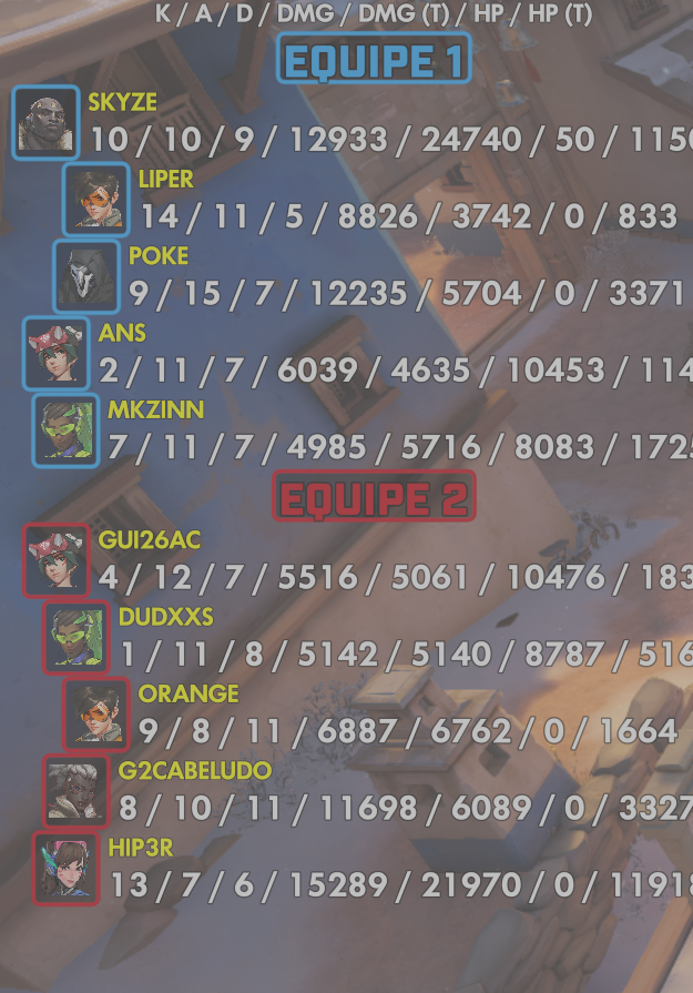 | Team | Player | Kills | Assists | Deaths | Damage | Damage (Taken) | Healing | Healing (Taken) |
