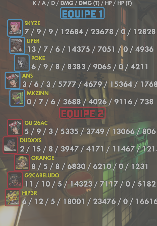 | Team | Player | Kills | Assists | Deaths | Damage | Damage (Taken) | Healing | Healing (Taken) |