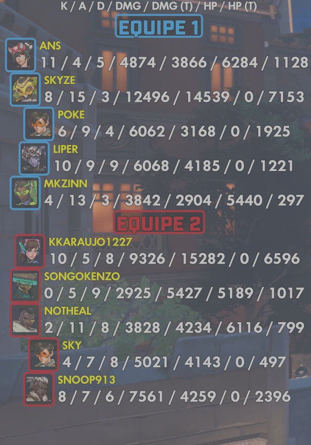 | Team | Player | Kills | Assists | Deaths | Damage | Damage (Taken) | Healing | Healing (Taken) |