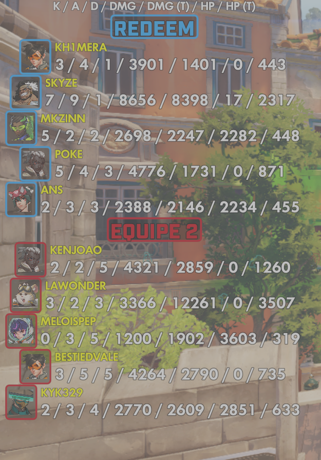| Team | Player | Kills | Assists | Deaths | Damage | Damage (Taken) | Healing | Healing (Taken) |