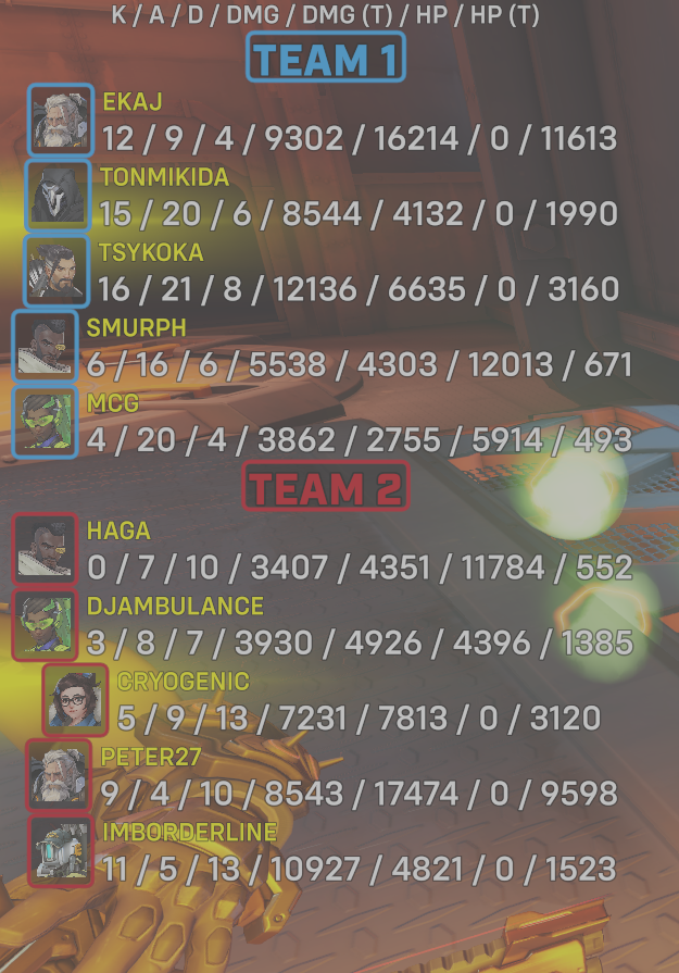 10 entries| Team | Player | Kills | Assists | Deaths | Damage | Damage (Taken) | Healing | Healing (Taken) |