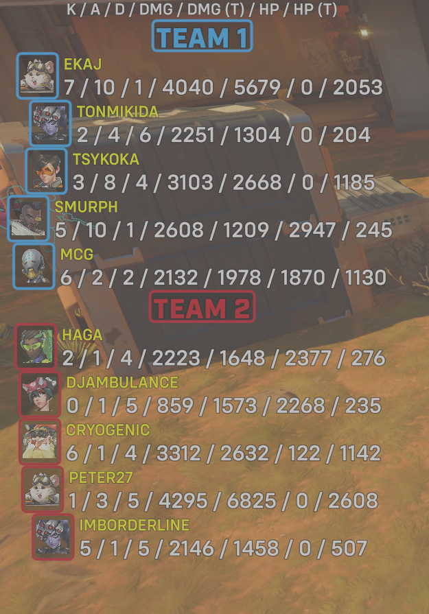 10 entries| Team | Player | Kills | Assists | Deaths | Damage | Damage (Taken) | Healing | Healing (Taken) |
