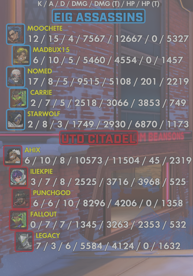 10 entries| Team | Player | Kills | Assists | Deaths | Damage | Damage (Taken) | Healing | Healing (Taken) |