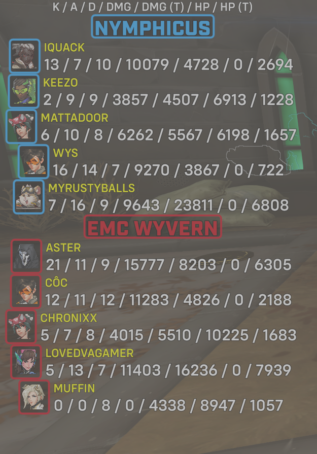 10 entries| Team | Player | Kills | Assists | Deaths | Damage | Damage (Taken) | Healing | Healing (Taken) |