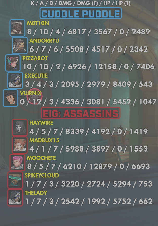 10 entries| Team | Player | Kills | Assists | Deaths | Damage | Damage (Taken) | Healing | Healing (Taken) |
