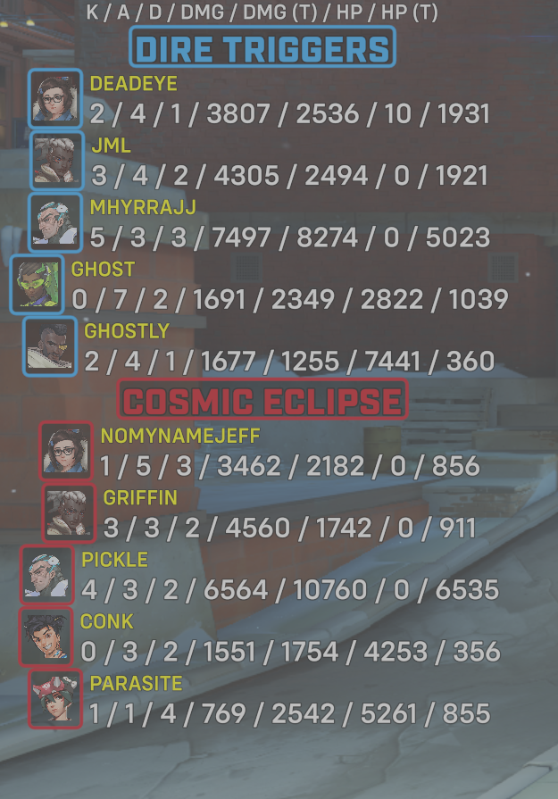 | Team | Player | Kills | Assists | Deaths | Damage | Damage (Taken) | Healing | Healing (Taken) |