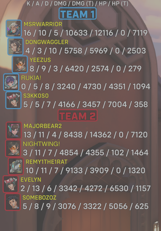 | Team | Player | Kills | Assists | Deaths | Damage | Damage (Taken) | Healing | Healing (Taken) |