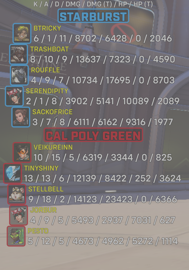 | Cal Poly Green | Unknown PlayerPlayer Most likely doesn't have their battletag updated on website | 4 | 9 | 7 | 10734 | 17695 | 0 | 8703 |