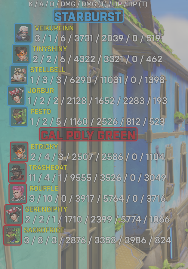 | Cal Poly Green | Unknown PlayerPlayer Most likely doesn't have their battletag updated on website | 3 | 10 | 0 | 3917 | 5764 | 0 | 3716 |
