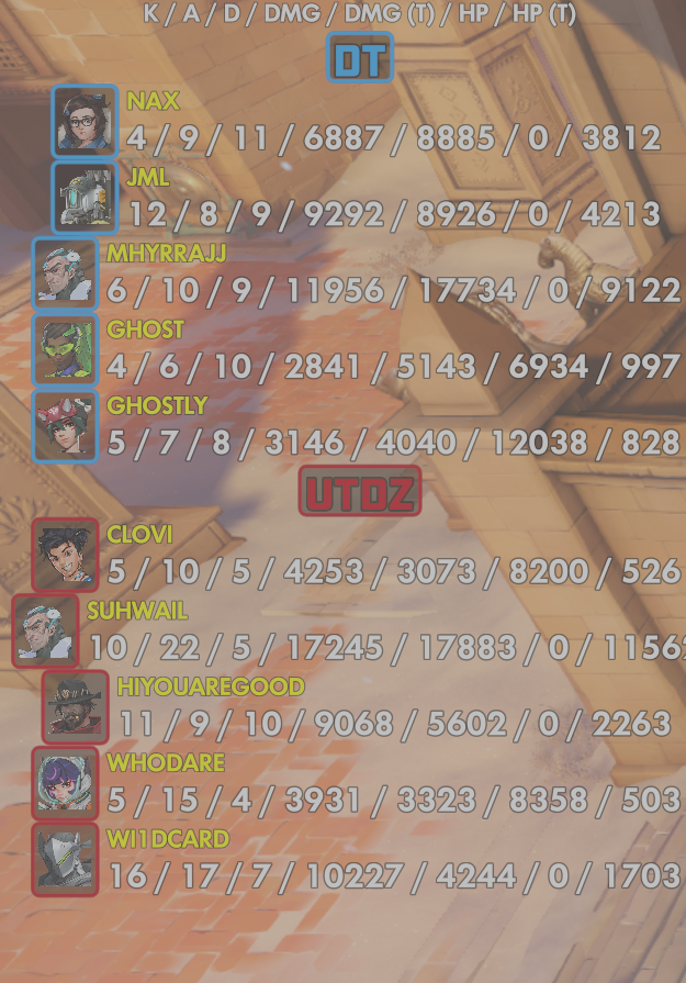 10 entries| Team | Player | Kills | Assists | Deaths | Damage | Damage (Taken) | Healing | Healing (Taken) |