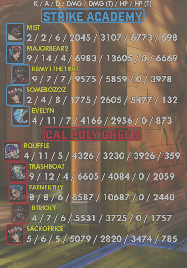 10 entries| Team | Player | Kills | Assists | Deaths | Damage | Damage (Taken) | Healing | Healing (Taken) |