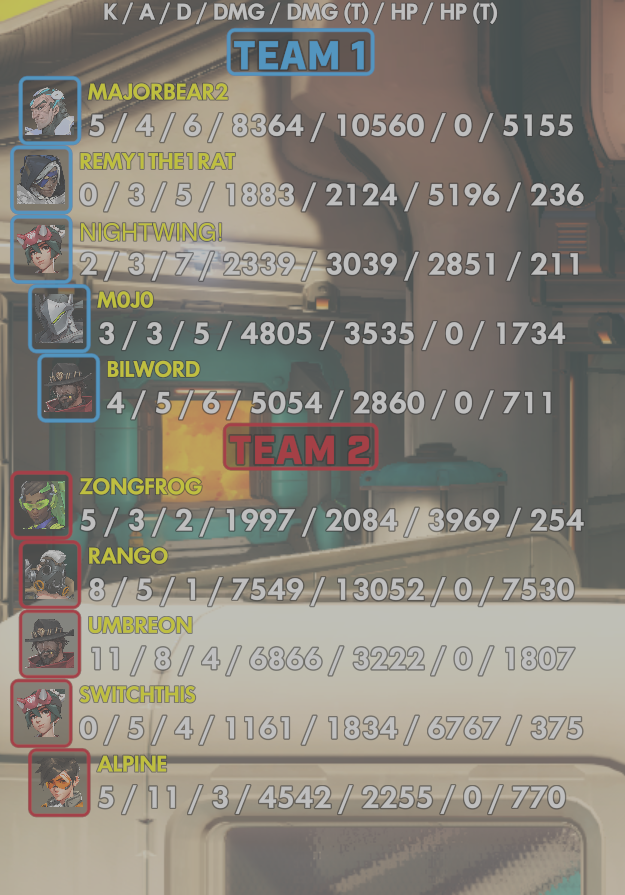 10 entries| Team | Player | Kills | Assists | Deaths | Damage | Damage (Taken) | Healing | Healing (Taken) |