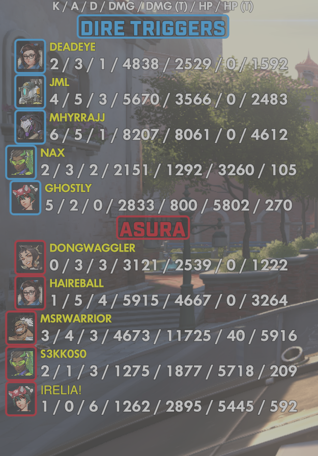 10 entries| Team | Player | Kills | Assists | Deaths | Damage | Damage (Taken) | Healing | Healing (Taken) |
