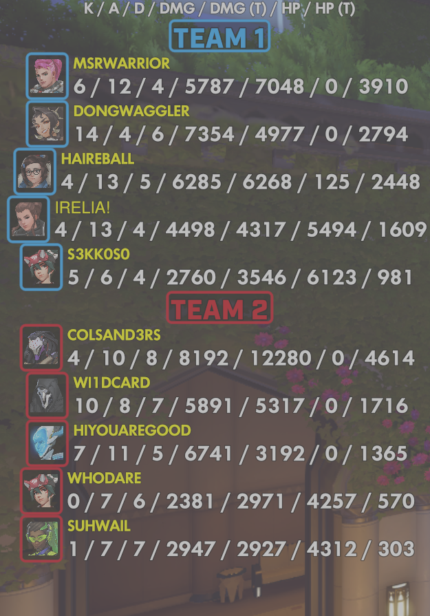 10 entries| Team | Player | Kills | Assists | Deaths | Damage | Damage (Taken) | Healing | Healing (Taken) |