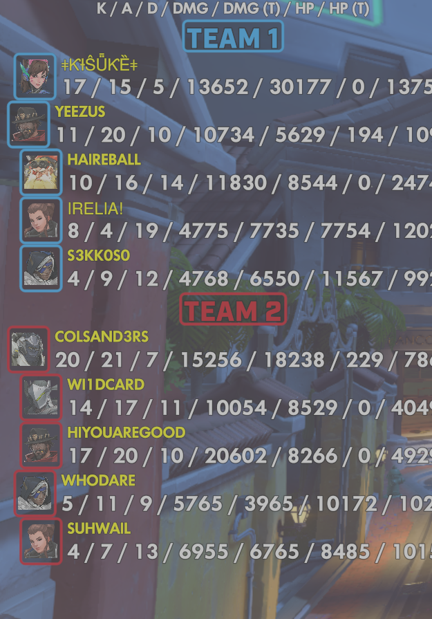 9 entries| Team | Player | Kills | Assists | Deaths | Damage | Damage (Taken) | Healing | Healing (Taken) |