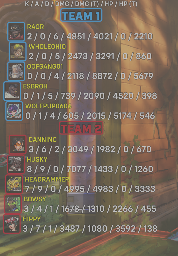 | Team | Player | Kills | Assists | Deaths | Damage | Damage (Taken) | Healing | Healing (Taken) |