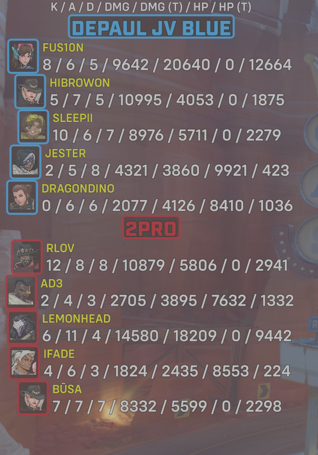 | DePaul JV Blue | Unknown PlayerPlayer Most likely doesn't have their battletag updated on website | 8 | 6 | 5 | 9642 | 20640 | 0 | 12664 |