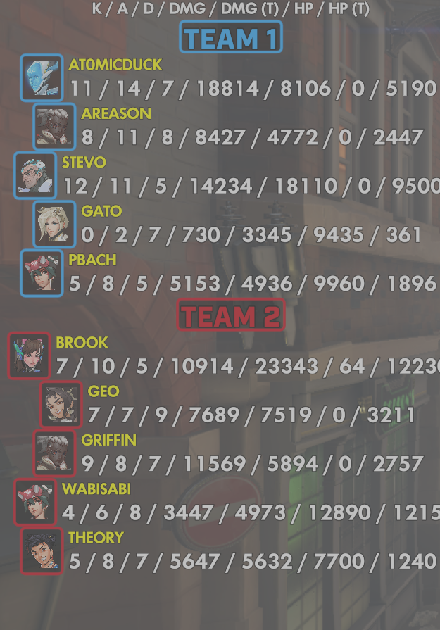 10 entries| Team | Player | Kills | Assists | Deaths | Damage | Damage (Taken) | Healing | Healing (Taken) |