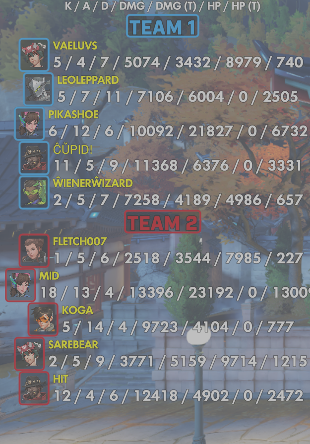 10 entries| Team | Player | Kills | Assists | Deaths | Damage | Damage (Taken) | Healing | Healing (Taken) |