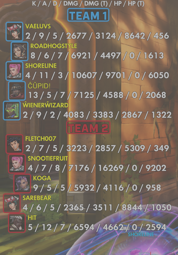 10 entries| Team | Player | Kills | Assists | Deaths | Damage | Damage (Taken) | Healing | Healing (Taken) |