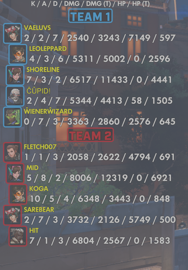 9 entries| Team | Player | Kills | Assists | Deaths | Damage | Damage (Taken) | Healing | Healing (Taken) |