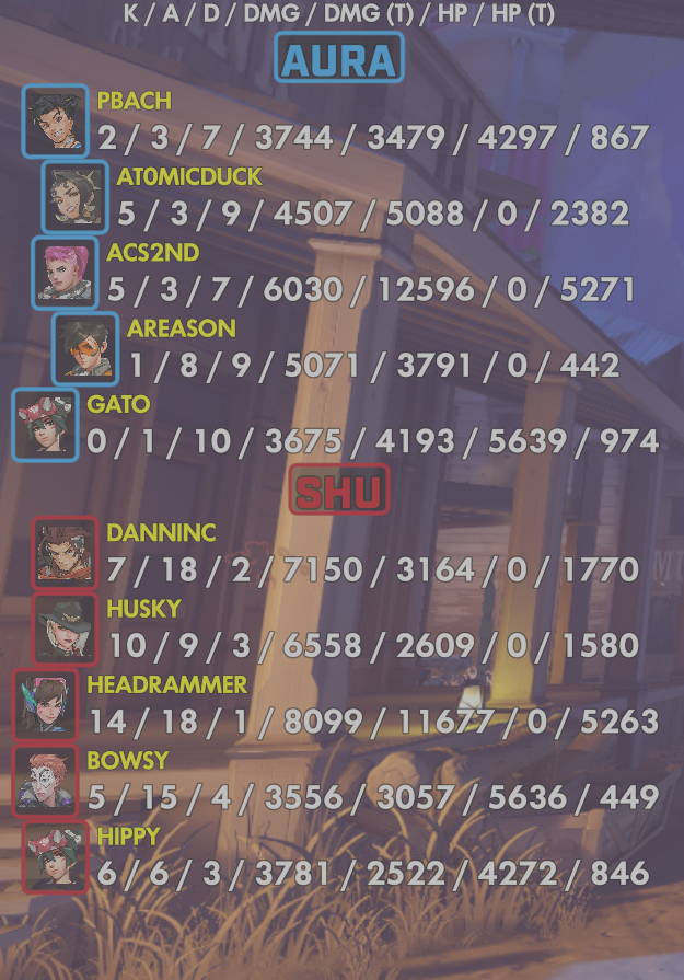 | Team | Player | Kills | Assists | Deaths | Damage | Damage (Taken) | Healing | Healing (Taken) |