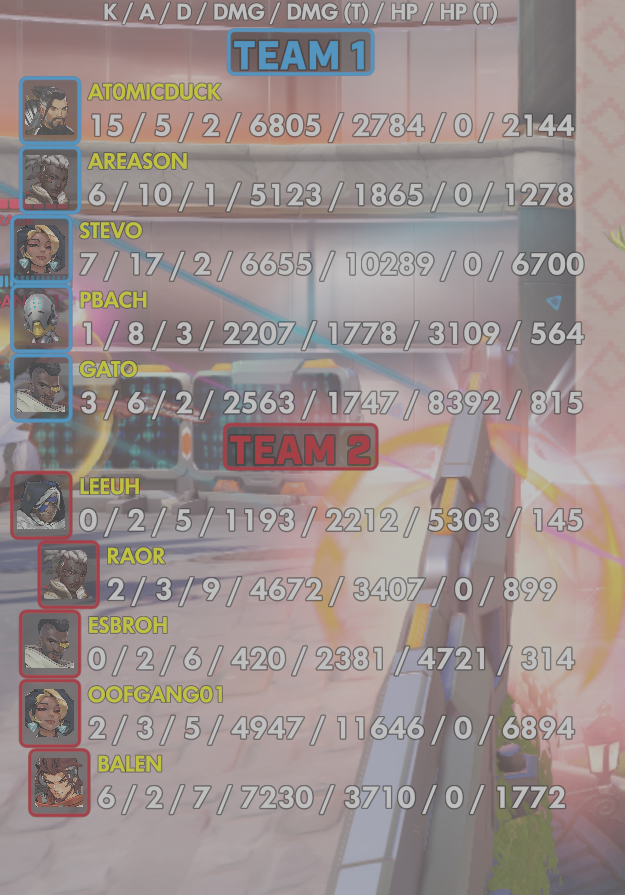 10 entries| Team | Player | Kills | Assists | Deaths | Damage | Damage (Taken) | Healing | Healing (Taken) |