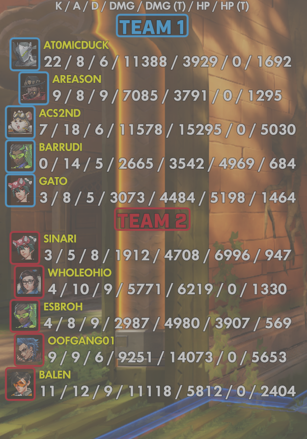 10 entries| Team | Player | Kills | Assists | Deaths | Damage | Damage (Taken) | Healing | Healing (Taken) |